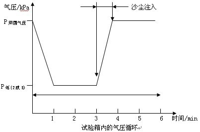 砂塵試驗(yàn)箱對于具有類型1外殼的樣品,應(yīng)放入試驗(yàn)箱,并按照正常使用位置安裝。樣品應(yīng)承受圖中規(guī)定的壓降周期。根據(jù)相關(guān)規(guī)范中規(guī)定,壓力降應(yīng)為2kPa(20mbar)或5kPa(50mbar) 。