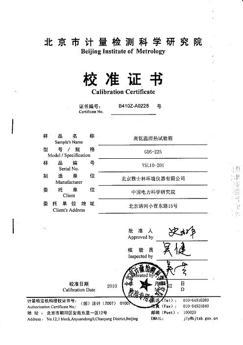 >>高低溫濕熱試驗(yàn)箱校準(zhǔn)證書(shū)-北京計(jì)量院-中國(guó)電科院2