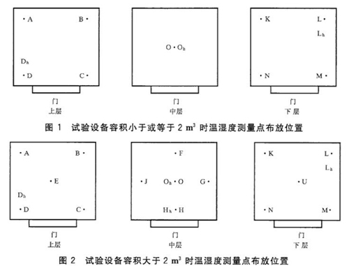恒溫恒濕試驗(yàn)箱濕度測量儀器采用干濕球溫度計(jì)或由其他濕度傳感器組成的濕度測量系統(tǒng),其測量結(jié)果的擴(kuò)展不確定度不大于被測溫度允許偏差的1/3。 恒溫恒濕試驗(yàn)箱濕度測量點(diǎn)數(shù)量及位置要求: 一,根據(jù)試驗(yàn)設(shè)備容積的大小,將工作空間分為上、中、下三層,中層通過工作空間幾何中心點(diǎn),將一定數(shù)量的相對濕度傳感器布放在其中規(guī)定的位置上,傳感器不應(yīng)受冷熱源的直接輻射。 二、相對濕度測量點(diǎn)用Oh、Dh、Hh、Lh表示。Oh位于中層的幾何心心,其他各測量點(diǎn)與試驗(yàn)設(shè)備內(nèi)壁的距離為各自邊長的1/10,但最大距離不大于500mm,最小距離不小于50mm。 三、恒溫恒濕試驗(yàn)箱容積小于或等于2m3時,相對濕度測量點(diǎn)為3個,如圖1所示。試驗(yàn)箱容積大于2m3時,相對濕度測量點(diǎn)為4個,如圖2所示。當(dāng)試驗(yàn)箱容積小于0.05 m3或大于50 m3時,可適當(dāng)減少或增加測量點(diǎn)。 四、每5min溫度平均變化速率測量點(diǎn)為工作空間幾何中心點(diǎn)。