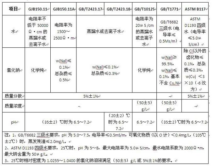 在鹽霧試驗(yàn)箱不同標(biāo)準(zhǔn)中對鹽霧試驗(yàn)用的鹽溶液有不同的要求,見下表:
