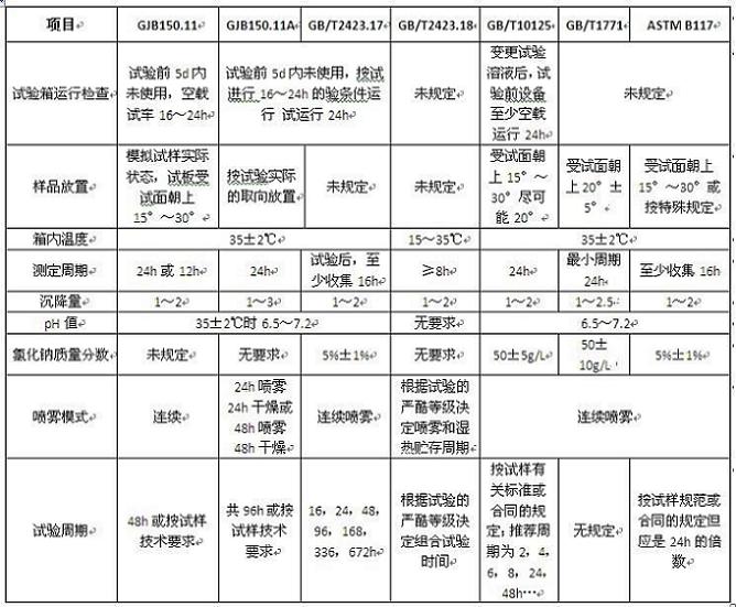 鹽霧試驗(yàn)箱要保證試驗(yàn)結(jié)果的正確性,必須控制好試驗(yàn)過(guò)程。試驗(yàn)過(guò)程的控制包括:試驗(yàn)箱運(yùn)行檢查、樣品放置、箱內(nèi)暴露區(qū)溫度、沉降液的參數(shù)(沉降量、PH值和氯化鈉質(zhì)量濃度)等,不同標(biāo)準(zhǔn)對(duì)鹽霧試驗(yàn)過(guò)程的控制要求見(jiàn)下表: