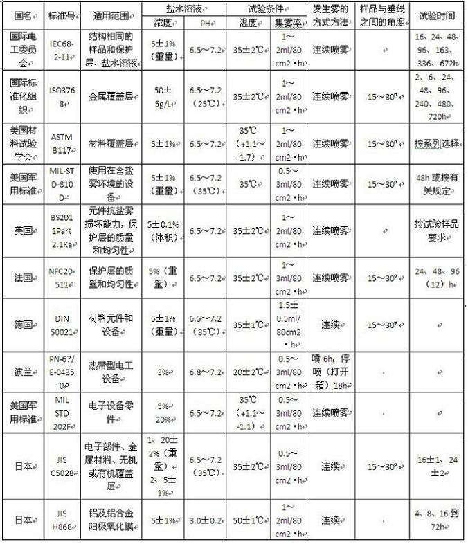 鹽霧試驗(yàn)箱各國(guó)標(biāo)準(zhǔn)試驗(yàn)方法對(duì)照表