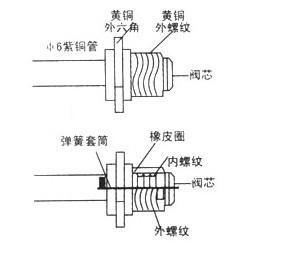 購單向閥一支,結(jié)構(gòu)見下圖。取下單向閥的閥芯,把單向閥焊在高低溫試驗(yàn)箱的工藝管上。確認(rèn)焊接牢固、無漏,再裝上閥芯。抽真空時(shí)用帶有頂針的加氟管連結(jié),另一頭與角閥連接。然后再接表和真空泵。抽真空后,卸下真空泵,換上加氟鋼瓶,排除角閥后(第二根加氟管)加氟管中的空氣,再加氟。